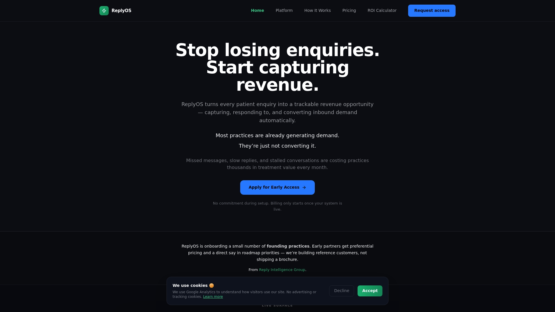 Start with the revenue leakage calculator to quantify exactly what your practice may be leaving on the table each month. Then explore the platform for full revenue workflow visibility, where you can see how ReplyOS centralises inbound enquiries, automates follow-up, and tracks every conversation from first contact to confirmed booking. When you are ready to commit, pricing and plans are transparent and designed to scale with your practice. The next step is yours.